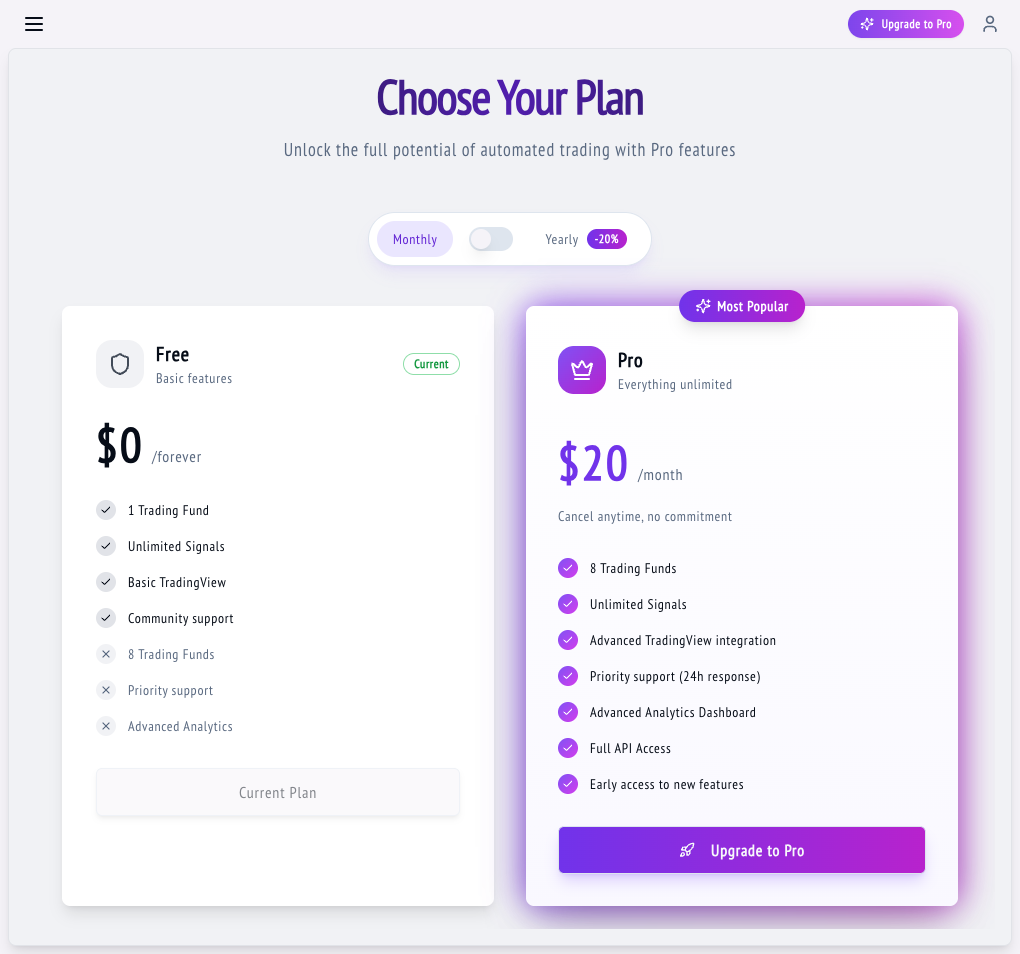 With Pro you can have up to 8 funds. Use separate funds to isolate different strategies (e.g., one for BTC scalping, one for ETH swing trading). Each fund has independent P&L tracking.